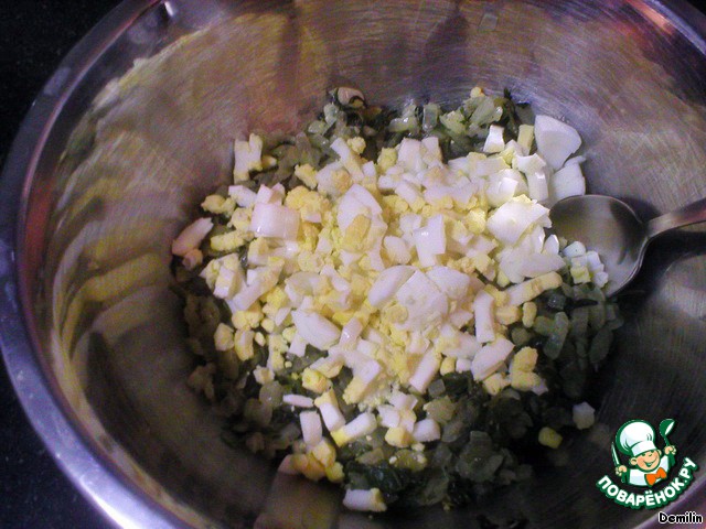 Нарезать или порвать руками листья шпината. Лук и отваренные яйца мелко порезать. Фету (125г) раскрошить.