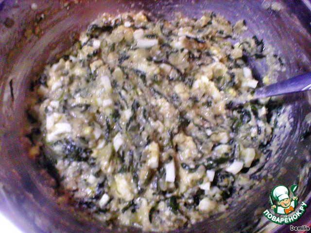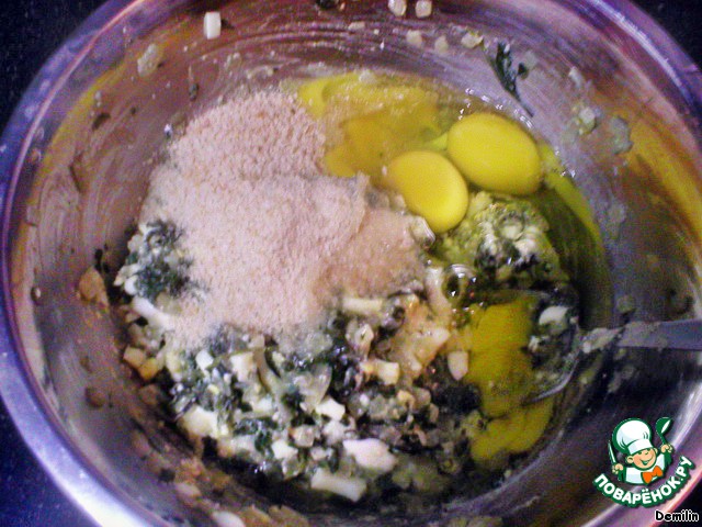 Для него берем 2 яйца + 1 белок, 1/3 стак. панировочных сухарей и 250г раскрошенной феты.