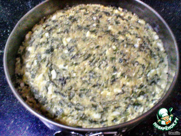 Выкладываем второй слой и ставим в разогретую до 180 градусов духовку.