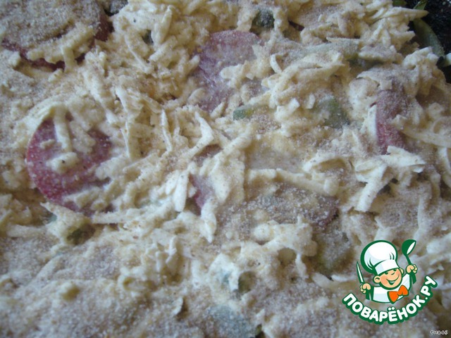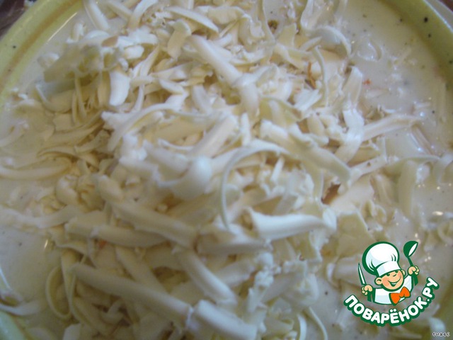 Трем на терке колбасный сыр прямо в заливку и тщательно все перемешиваем.