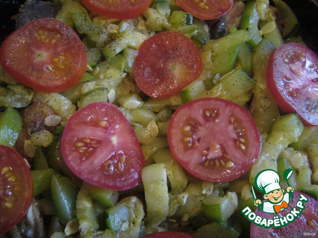 и кабачки и помидоры, порезанные кольцами.