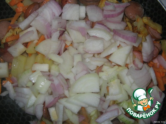 Морковь нарезаем соломкой и добавляем к обжаренным сосискам и картошке.