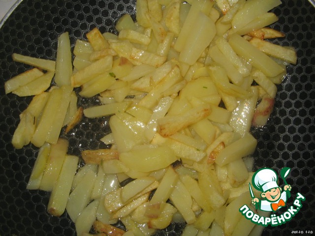 Чистим, моем и нарезаем картофель брусочками. Обжариваем его в растительном масле.