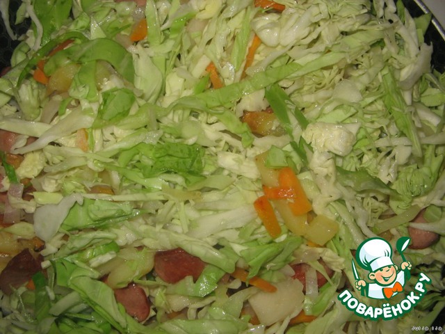 Когда всё немного обжарится, добавляем нарезанную капусту. Я её режу средней соломкой, чтобы чувствовалась, но не была сильно крупной.