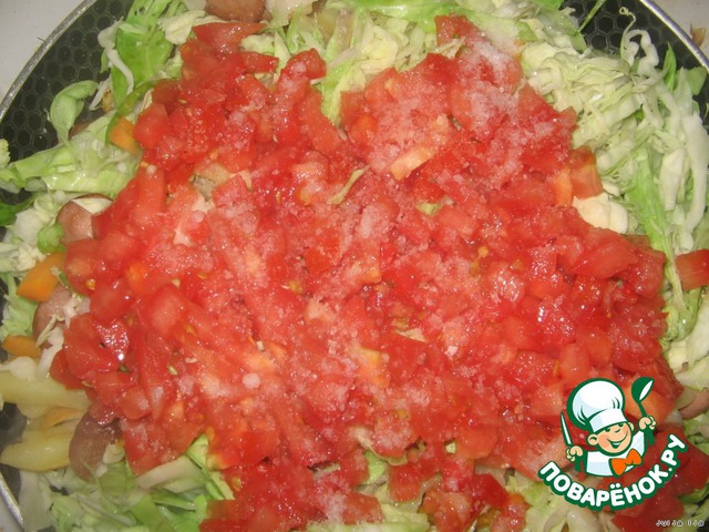 Нарезаем помидоры. Можно снять с них кожицу, но это совсем не обязательно. Выкладываем на капусту, перемешиваем и добавляем совсем немного воды.
