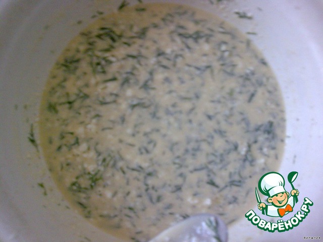 Яйца взбить со сметаной, посолить, поперчить,добавить чеснок и укроп.