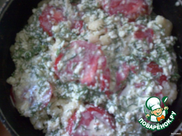 Сверху все залить творожно-яично-сметанной смесью. Поставить в духовку на 20 минут.