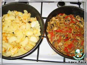 Шампиньоны моем, режем и заливаем на 10 минут кипятком. Картошку нарезаем произвольно, разогреваем сковородку, выкладываем (масла не очень много).