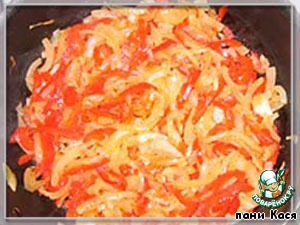 2. Лук и перец режем соломкой, пассеруем на небольшом огне, пока перчик не станет мягким, а лучок золотистым, почти прозрачным (но не покроется корочкой).
