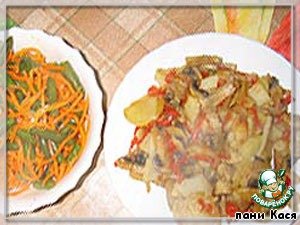 4. Содержимое двух сковородок перемешиваем (оно уже готово). Подаем с салатом из моркови и зеленой фасоли (корейским).