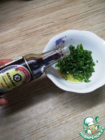Делаем быстренько заправку. Базилик измельчаем. К нему добавляем соль, перец, винный уксус, соевый соус и оливковое масло. Тщательно размешиваем-растираем.