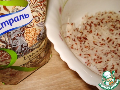 Смесь риса с киноа от Мистраль промоем, высыпаем в кастрюлю, заливаем 2 стаканами воды. Доводим до кипения, посолим и варим крупу минут 12. Воду сливаем и даем крупе остыть.
