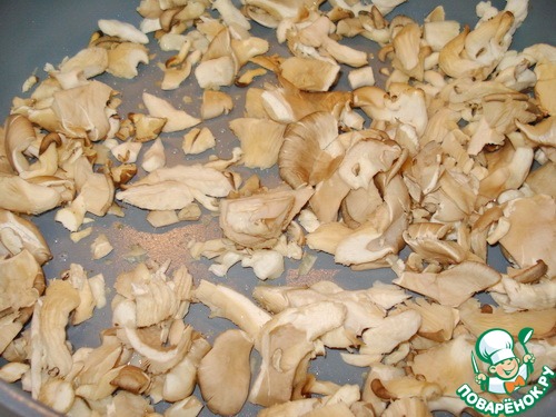 Грибы порежем и обжарим на сковороде, добавив немного растительного масла 6-8 минут, пока выделившаяся жидкость полностью не выпарится.