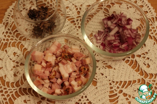 Бекон нарезать кубиками, лук мелко покрошить