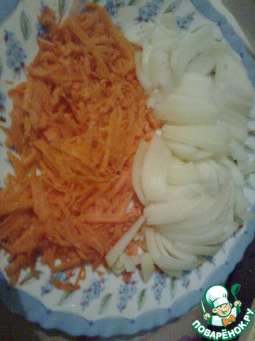 Морковь натереть на крупной терке. Лук разрезать полуполукольцами ( не знаю как правильно это назвать, думаю по фото понятно).