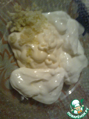 В миске смешать майонез, сметану, туда же добавить 3 дольки чеснока и хорошенько перемешать.