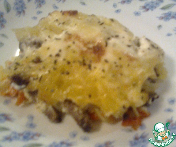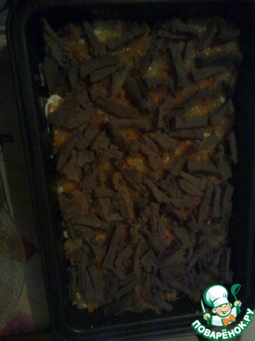 Выложить сверху морковь с луком (всю) вместе с маслом в котором они обжаривались (если конечно его не очень много). Посолить.