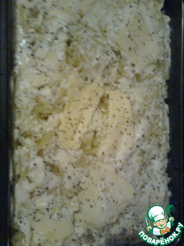 Выложить второю половину картофеля, посолить и смазать соусом ( у меня соуса не хватило, поэтому верх смазала просто майонезом). Сверху выложить кусочками сливочное масло.