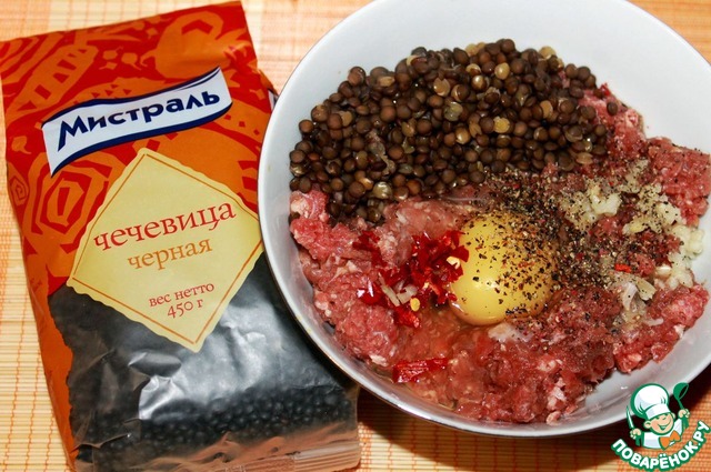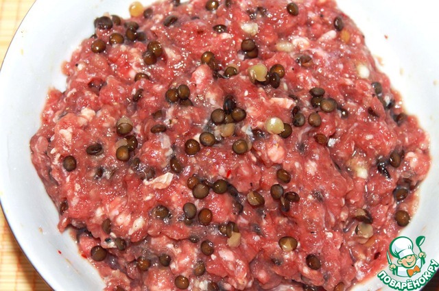 Смешать бараний фарш, отваренную черную чечевицу, чеснок, раздавленный в чеснокодавке, перчик чили, яйцо, соль, молотую зиру, черный перец