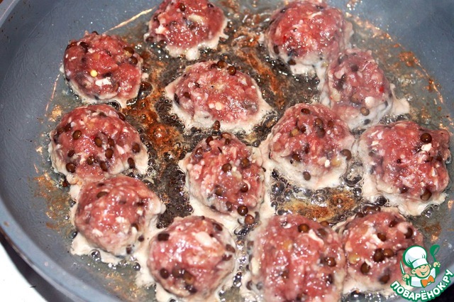 Из фарша скатать шарики с грецкий орех и обжарить недолго со всех сторон в растительном масле