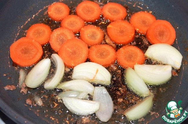 Лук порезать на восьмушки, морковь круглешками, толщиной 0.5 см, и обжарить до золотистости в оставшемся от тефтелек масле