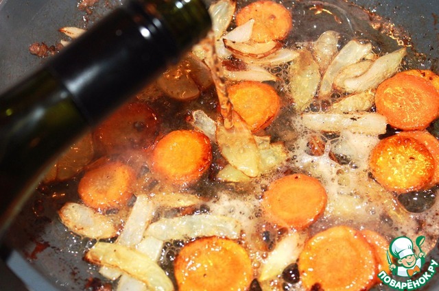 Добавить белое сухое вино и потушить минут 5
