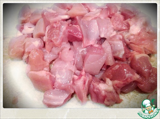 Отделить мясо от костей и кожи. Нарезать кубиками.