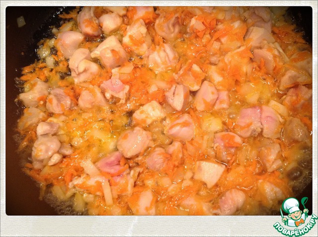 Сковороду разогреть с маслом, обжарить курицу с овощами. Добавить полстакана воды и потушить 15 минут под крышкой.