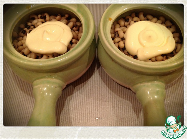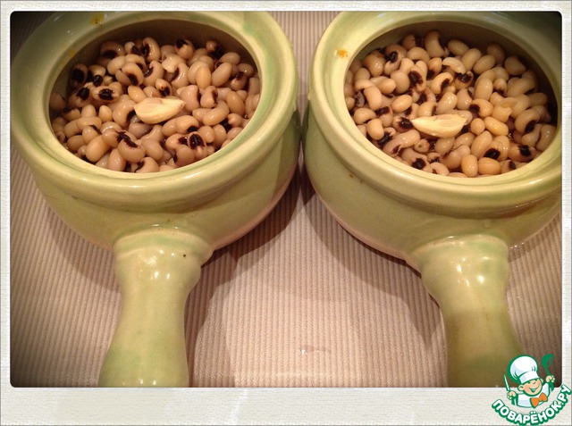 Далее выложить фасоль, сверху половинку зубчика чеснока. Долить воды, чтобы она чуть показалась ( с верхом заливать не нужно)