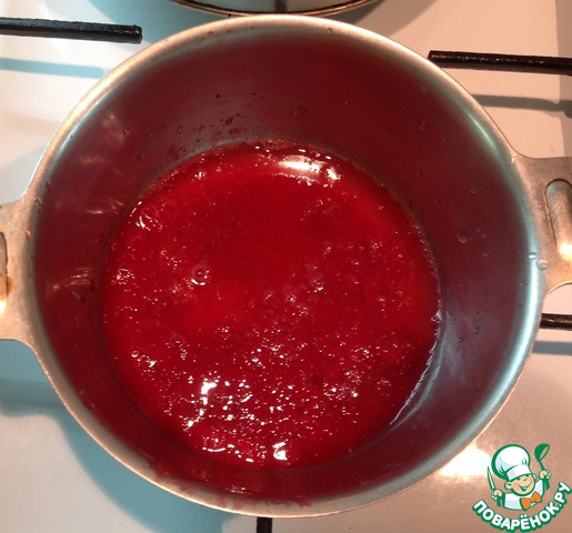 Выжатый сок поставить на огонь, добавить вино, сахар и корицу, перемешать и довести до кипения. Крахмал развести в 2ст. л. холодной воды и ввести, тщательно перемешивая, в соус.