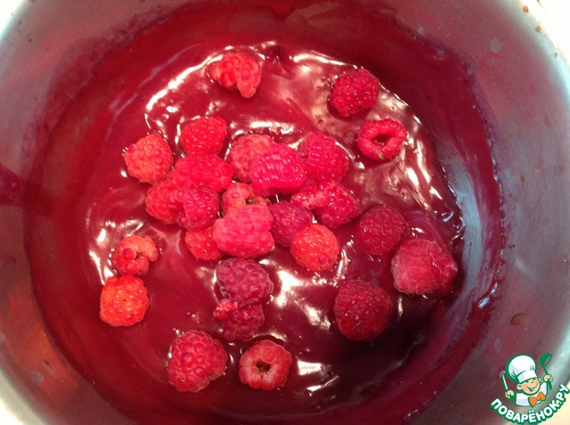 Затем добавить ягоды малины, перемешать и готовить 1 мин. Снять с огня.