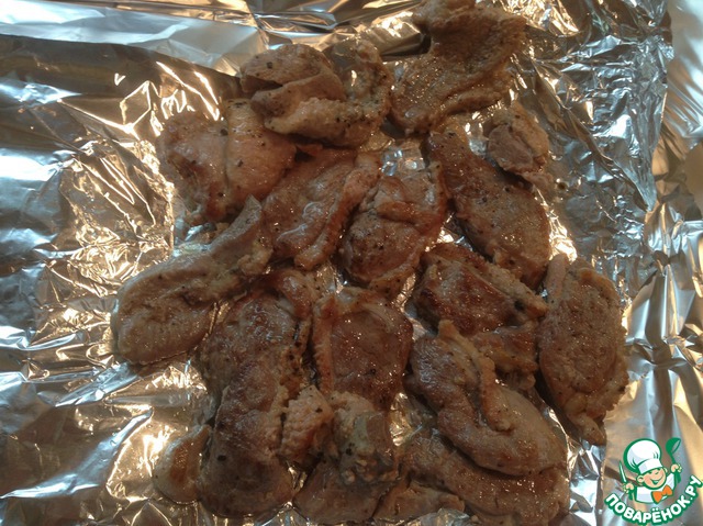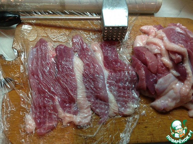 Положить кусочки на доску и хорошо отбить через пищевую пленку.