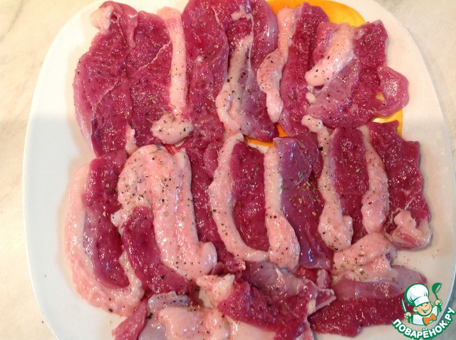 Отбитое мясо посолить, поперчить по вкусу, можно посыпать сухими травками.