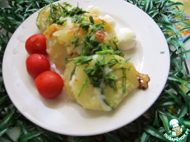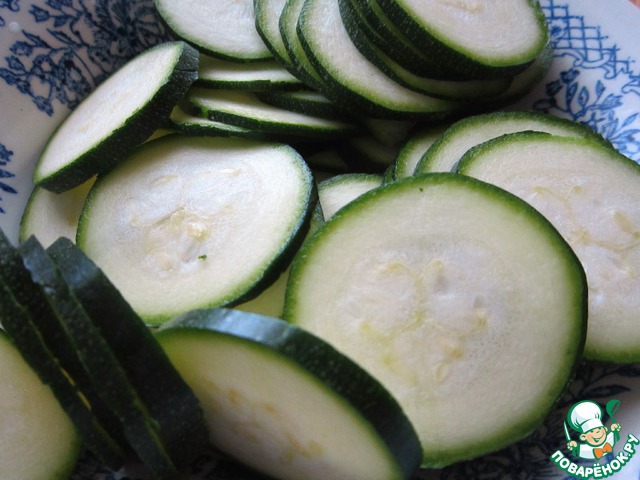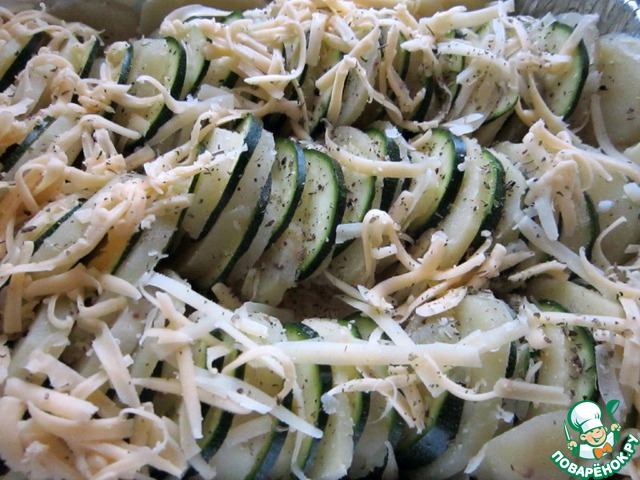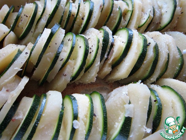 Разложить рядами, поочередно кружочки картофеля и цуккини. Посолить и поперчить.