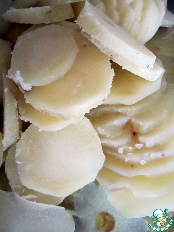 Картофель вымыть, отварить в кожуре до полуготовности. Картофель очистить и нарезать кружочками.
