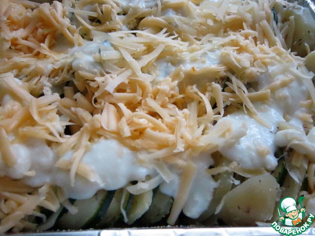 Полить овощи соусом бешамель и посыпать оставшимся сыром. Запекать 30 минут.