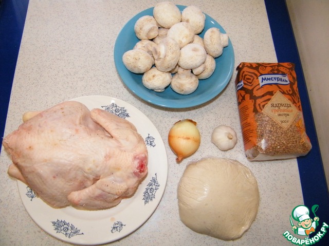 Готовим все ингредиенты: небольшая луковица и небольшая головка чеснока, гречневая крупа, курица, грибы шампиньоны и готовое пельменное тесто.