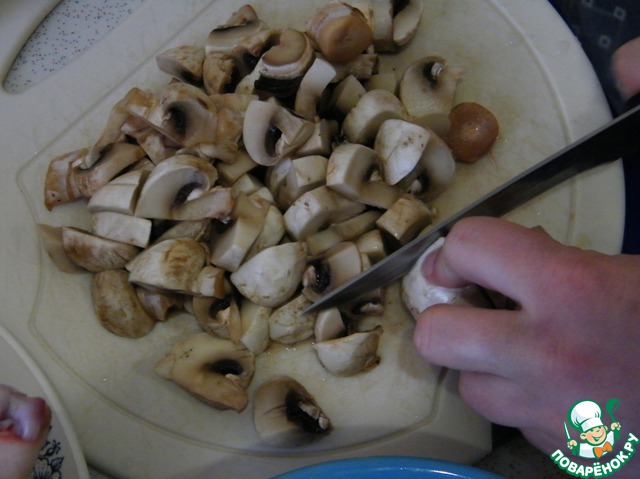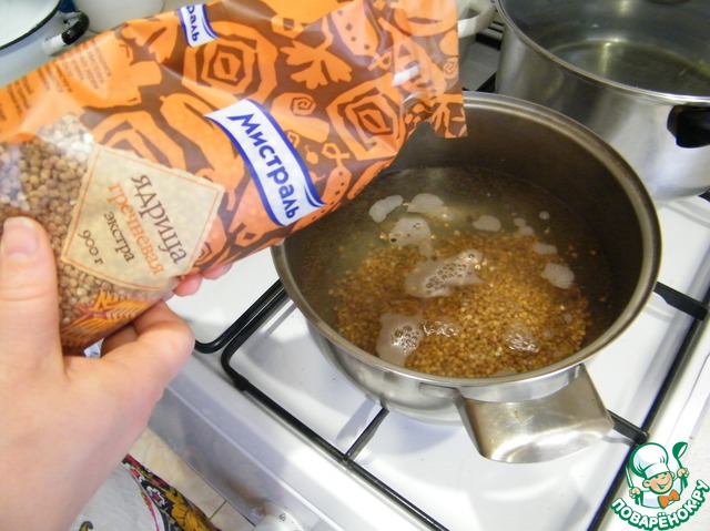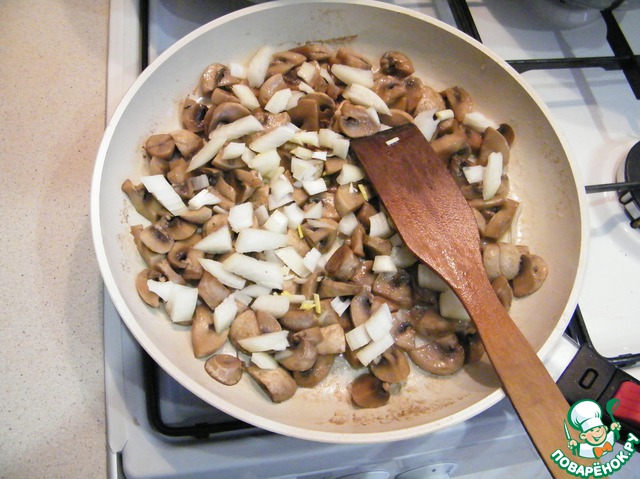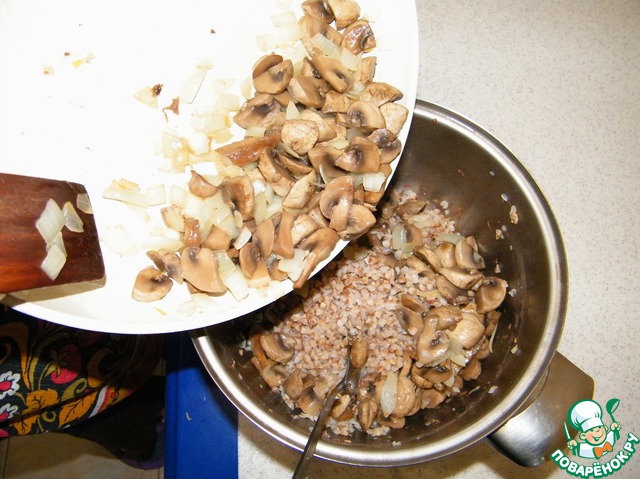 Готовим начинку для курицы: смешиваем грибы вместе с гречкой.