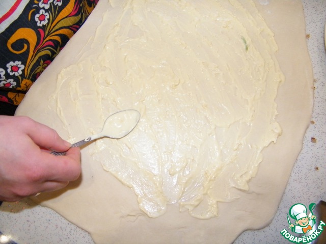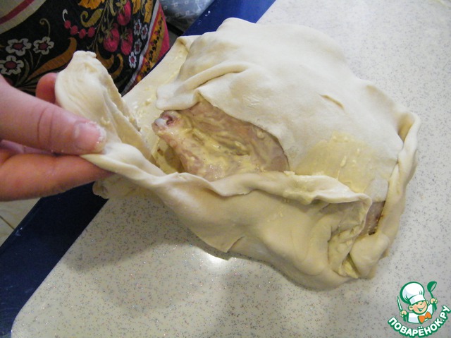 Курица также обмазывается соусом и заворачивается в тесто. Затем запекается в духовке до золотистого цвета.