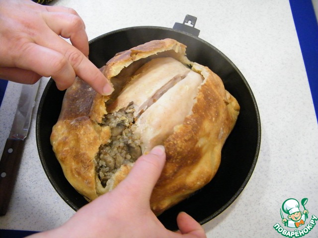 | Блюдо подходит для праздничного и повседневного стола. Вкусно здесь все: и курица, и тесто, и начинка. |
