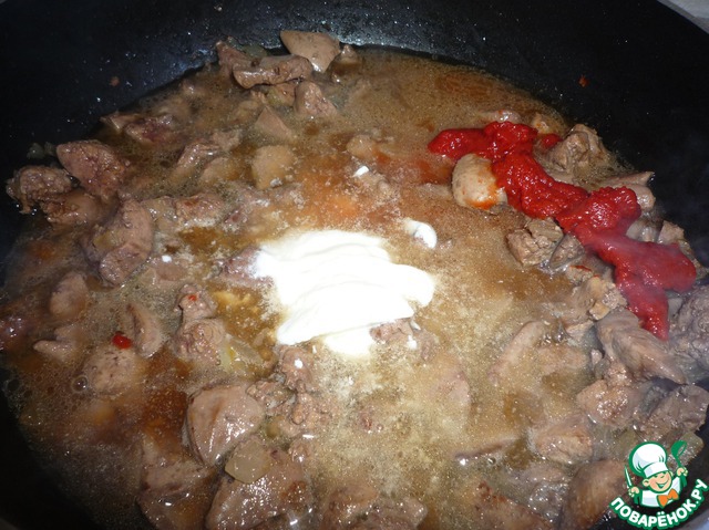 Выкладываем в сковороду с печенью и луком сметану (йогурт) + томатную пасту + немного воды. Перемешиваем и тушим 25-30 минут.