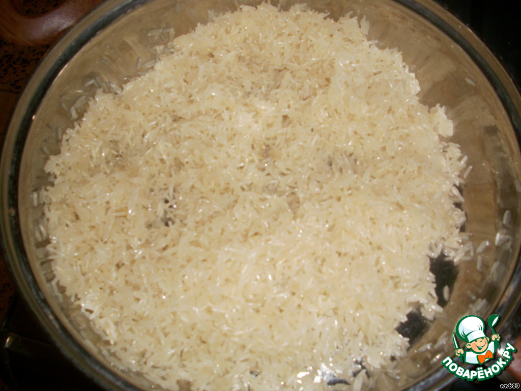 Рис промыть. Бланшировать на медленном огне, постоянно помешивая, 5 минут. Посолить. Залить 1 стаканом воды и варить на медленном огне до готовности.