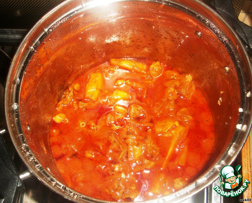 6.Влить 2 стакана воды и варить до готовности мяса.