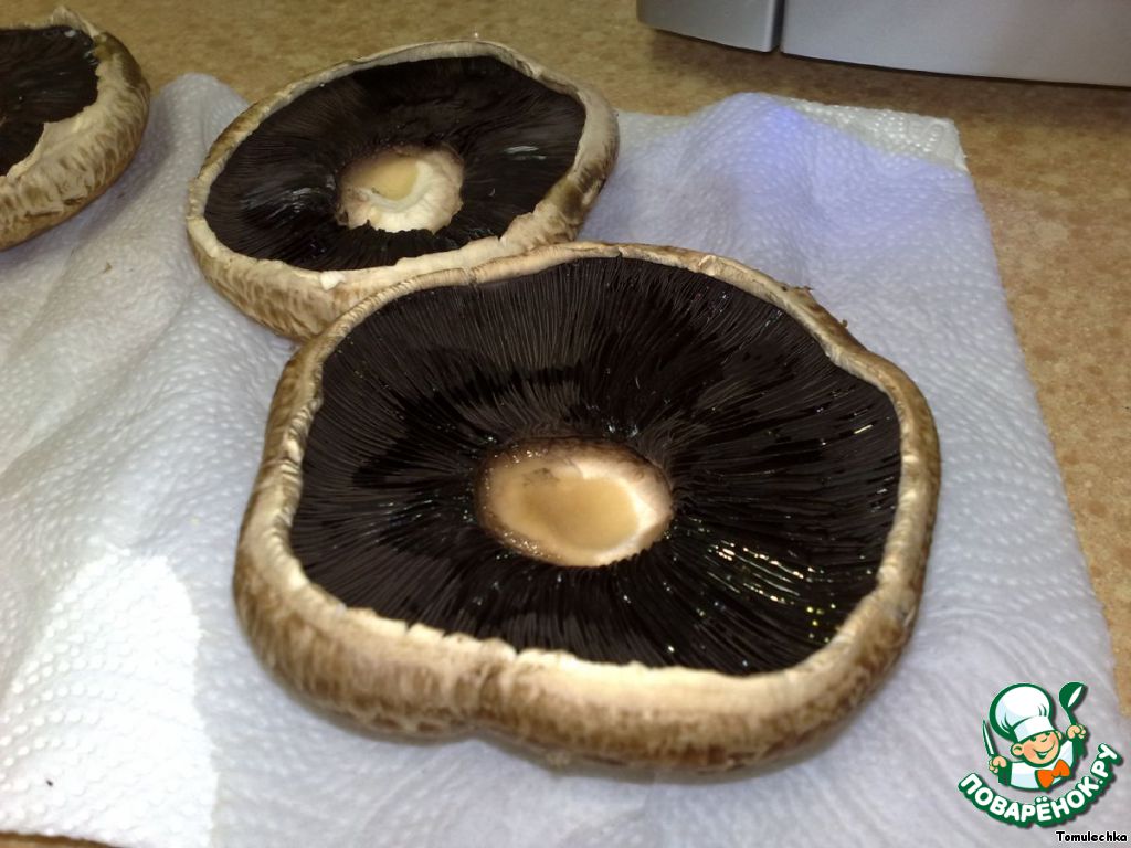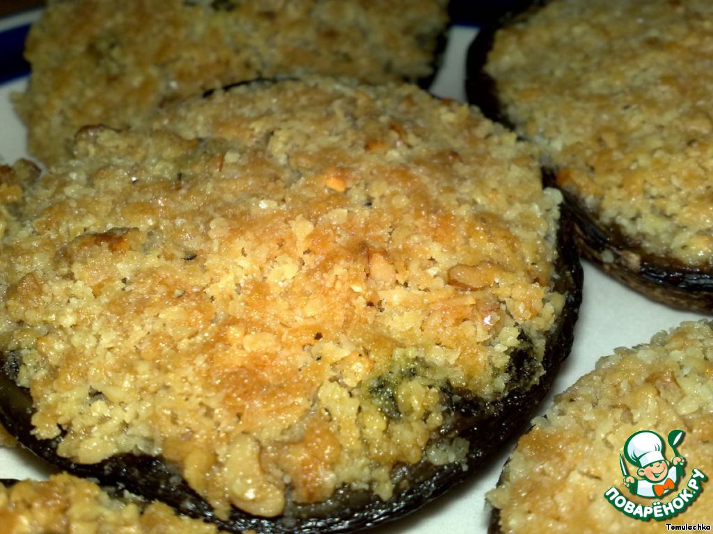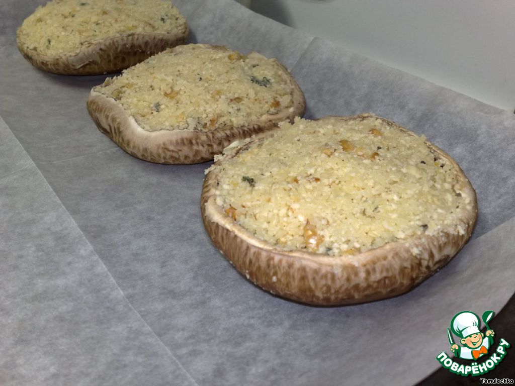 Грибы Портобелло, фаршированные пармезаном, панировочными сухарями, орехами и базиликом