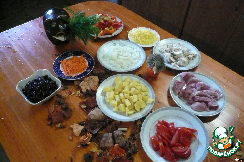 Порезали морковь, лук, картошку, грибы, мясо, помидоры. Затем пережариваем лук с морковью и отдельно помидоры с чесноком и грибами.