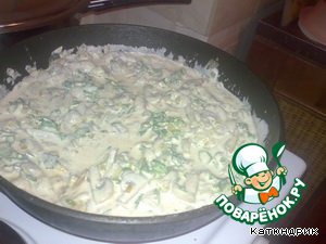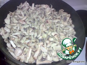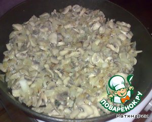 4. Сливаем воду с грибов и добавляем в грибы лук. Жарим 5 минут.