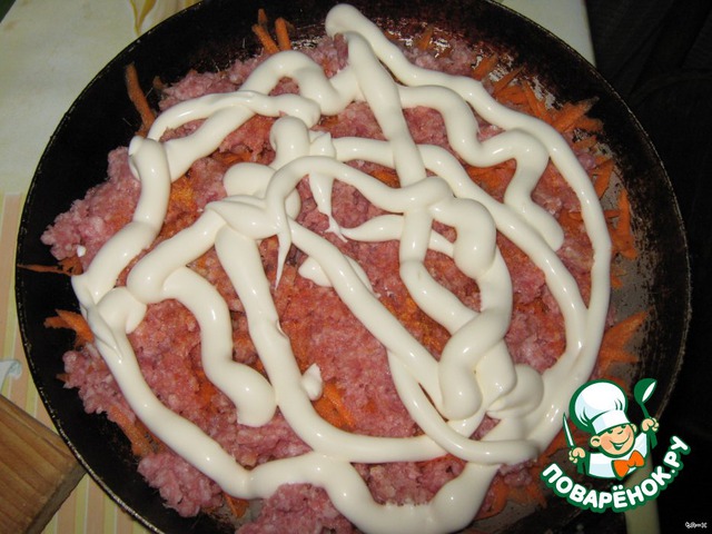 Затем посыпаем половиной тертой моркови, выкладываем фарш, солим, перчим, специи по вкусу, и поливаем майонезом.