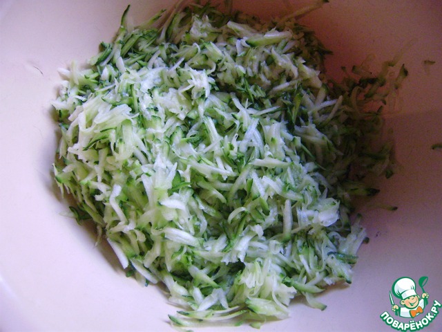Сыр тоже натереть и выложить к кабачку. Добавить яйца и все перемешать.