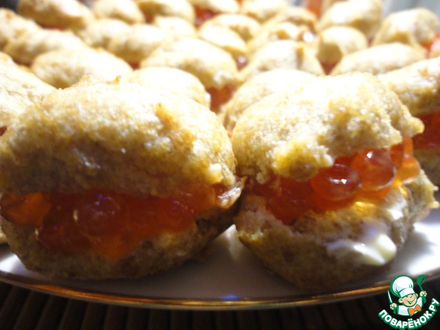 | Икра - штука деликатесная и употреблять ее, просто намазав на батон с маслом, как-то банально. Для икры лучше что-то по-интересней придумать. Вообще по правилам сервировки икру подают в гордом одиночестве – ее просто выкладывают в икорницы или небольшие салатники, которые ставят на лед. На кремлевских приемах икру выкладывали в ледяные резные салатницы, которые вырубали из больших кусков льда и украшали. Можно конечно соорудить подобную в силиконовой форме, но в домашних условиях это не очень практично. Икорница через час начнет таять и мы получим неприглядную картину и мокрую скатерть. Вообще существует множество не банальных способов подать икру: на слоеных валованах, мафинах, на перепелиных яйцах, на суши, с блинами и т. п. Предлагаю свой способ - на ржаных эклерах. Заходите и угощайтесь! |