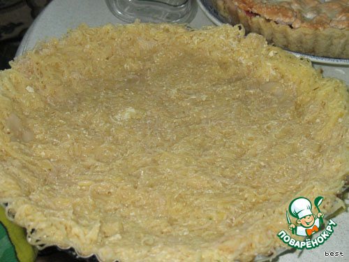 Натереть картофель на крупной тёрке, смешать с маслом и сыром. Выложить в форму, плотно прижав к стенкам и дну формы.